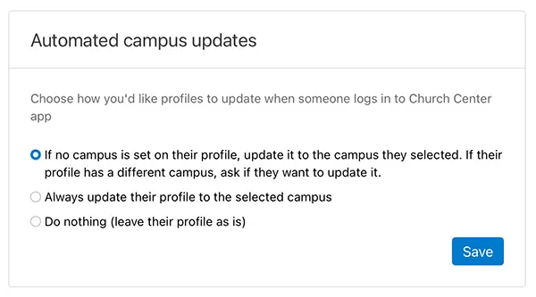 In your Church Center settings in People, you’ll find a new setting for automated campus updates.