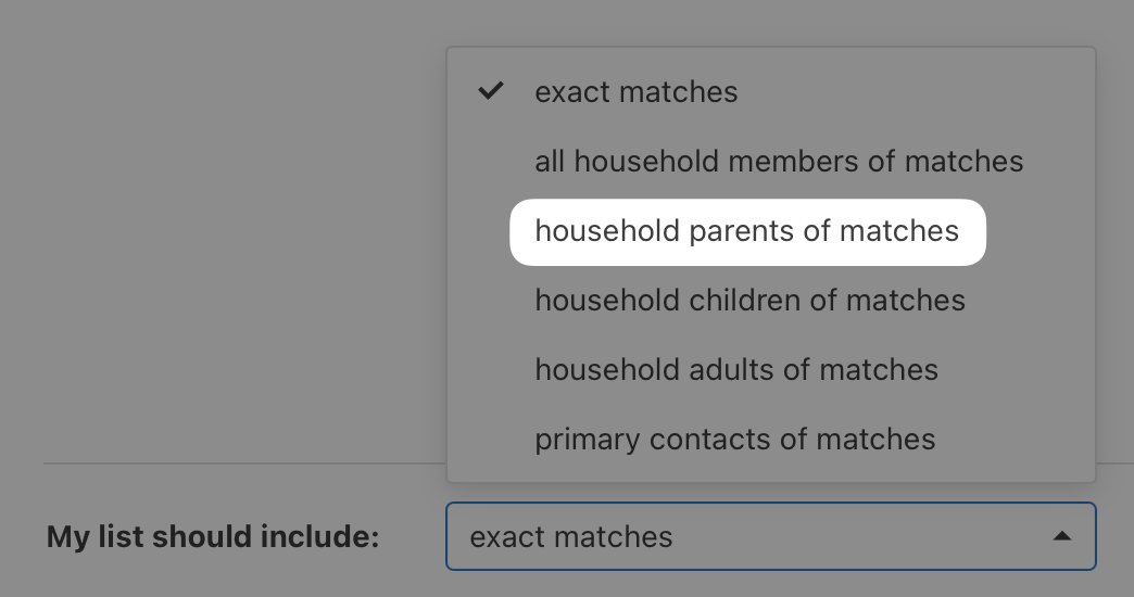 We've also added a new list inclusion option: household parents of matches. This lets you build a list of children (say, all 6th-8th graders) and automatically include their parents in your results—perfect for when you need to email parents about an upcoming youth event or schedule change.