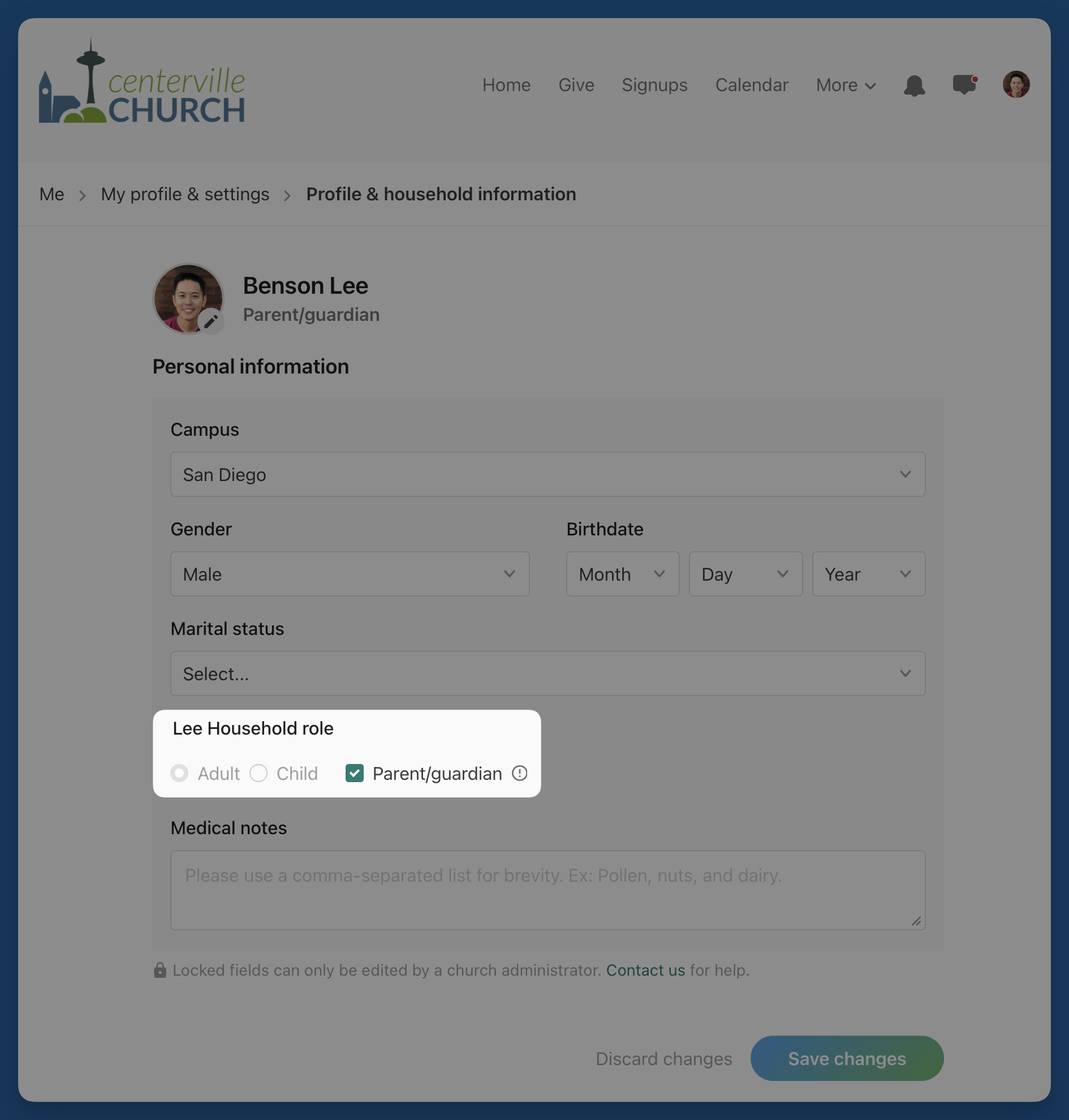 In Church Center, household adults can view and update their household roles on their own profiles, empowering your congregation to keep that information up to date without extra work on your end.