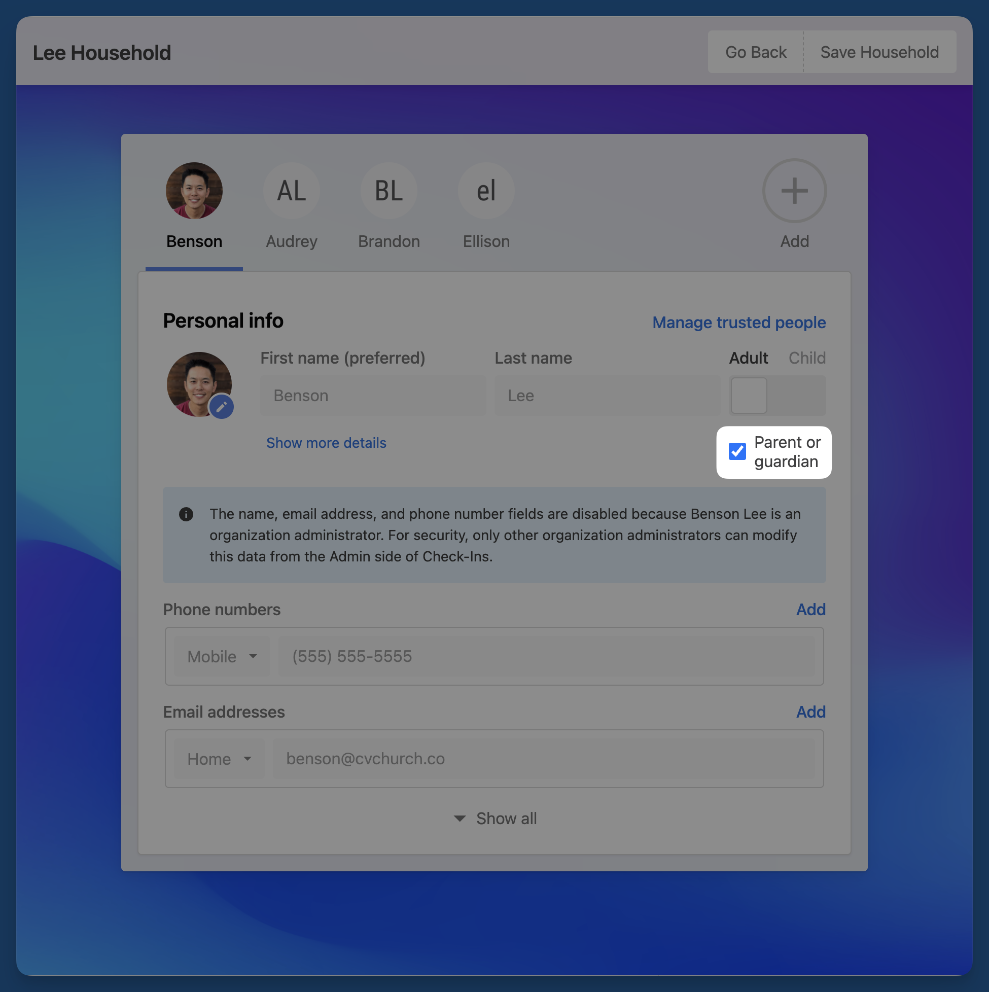 On Check-Ins stations, the parent/guardian role appears when editing a household, giving your check-in volunteers helpful context about family relationships.