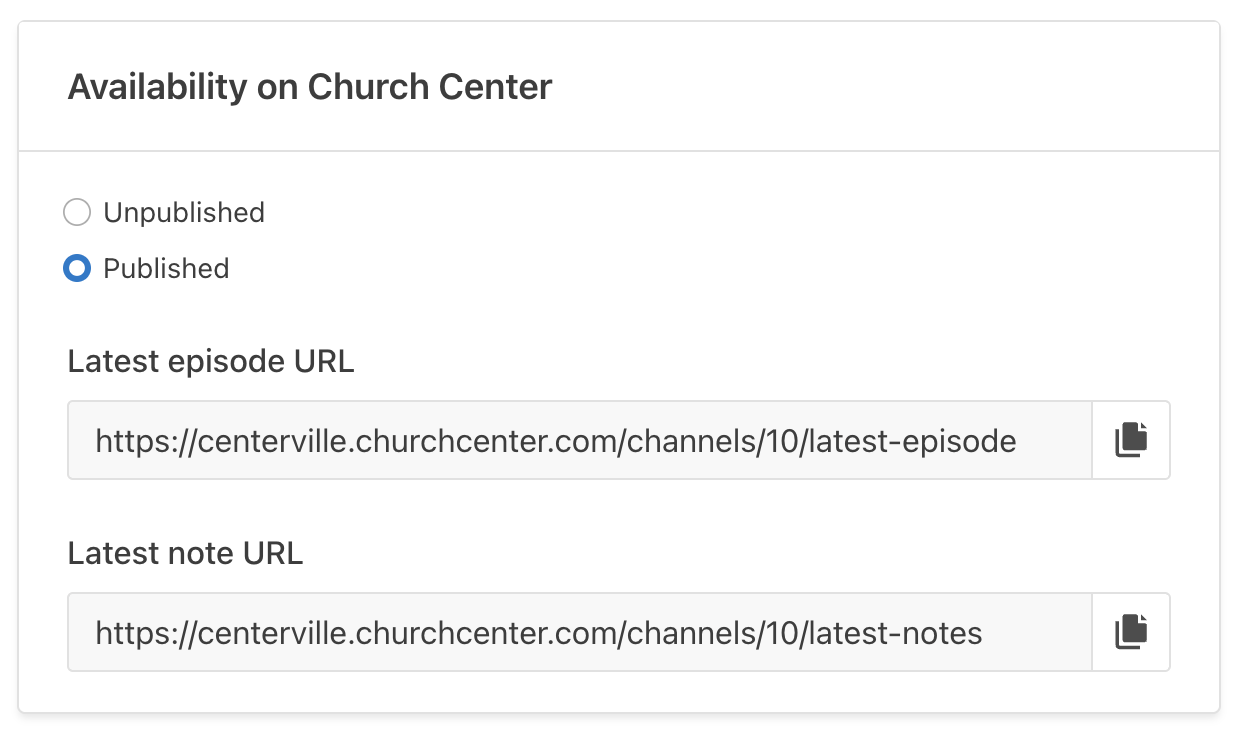 In your channel settings, you'll see the latest episode URL. If sermon notes are enabled for your channel, there will be a second link for latest notes as well!