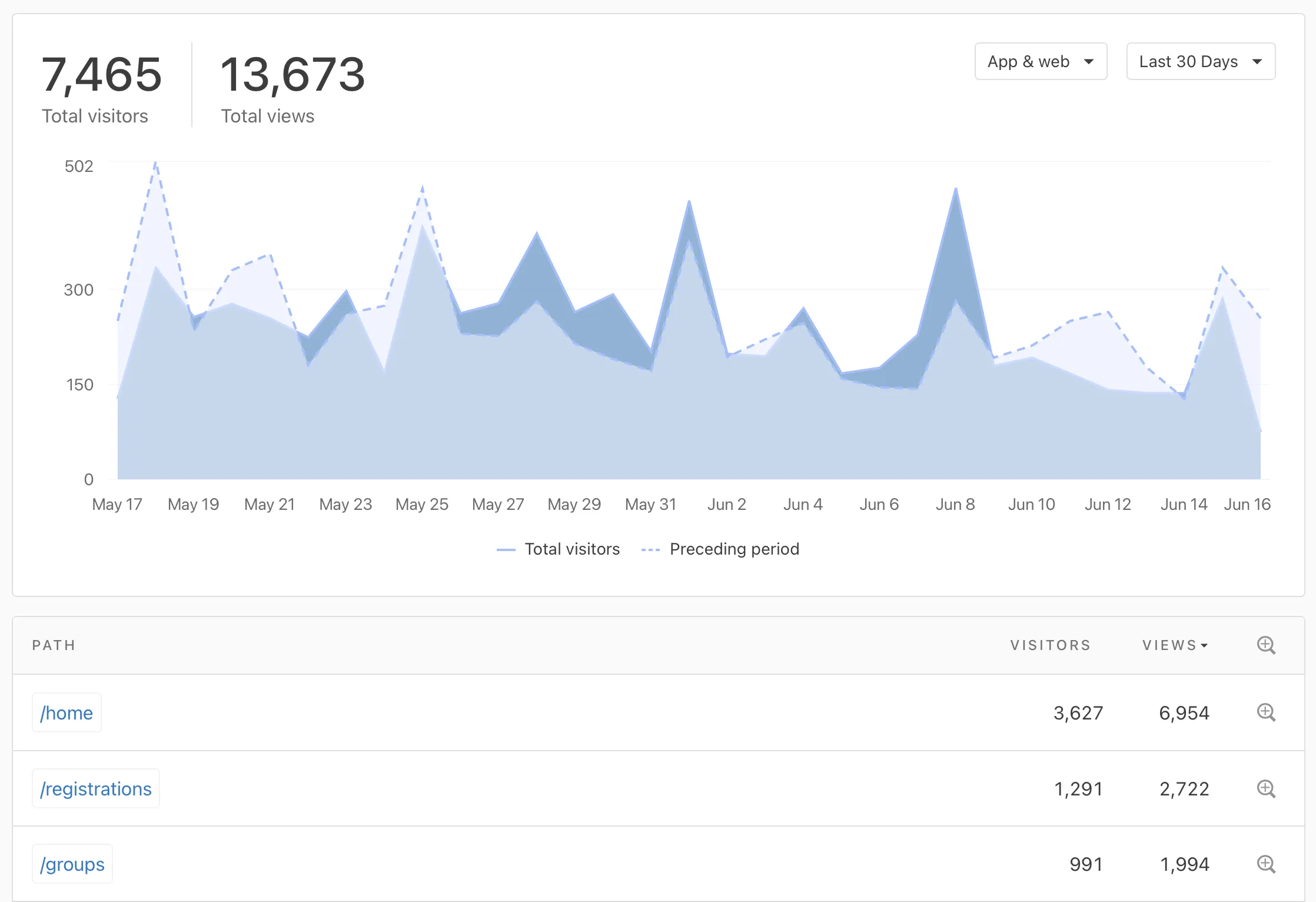 In Publishing, you'll find a new tab for Analytics, where you can see the total number of visitors and page views over your selected timeframe. This includes both built-in pages (like groups and Registrations signups) as well as custom Publishing content (like custom pages and sermons)!
