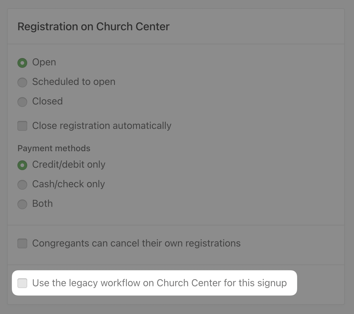 This new Church Center experience is now available for all detailed signups — and it's the default for new detailed signups created on or after January 10. But you can decide when you want to start using it for your preexisting signups! To use the new workflow, uncheck the legacy workflow checkbox in the Registration on Church Center settings: