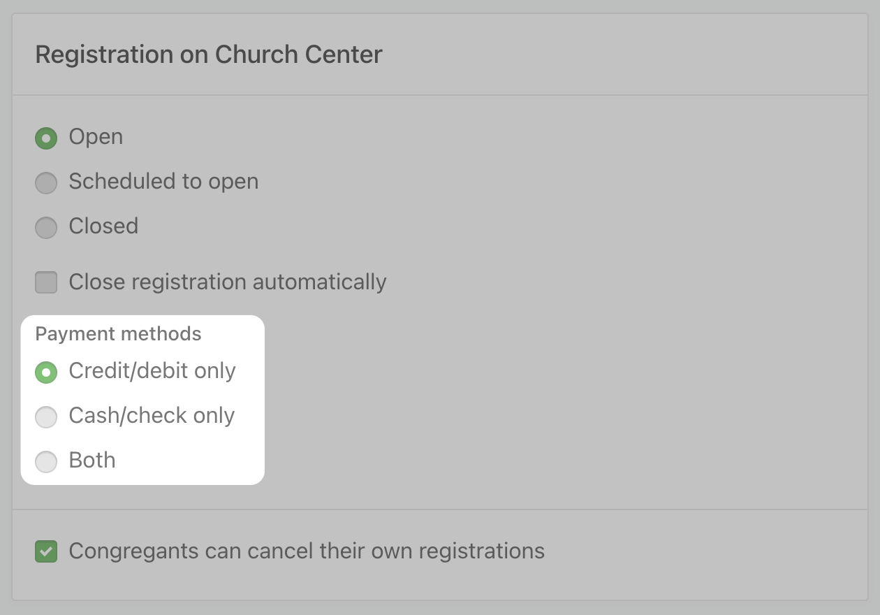 For each of your signups, you can choose to accept payment by cash/check, credit card, or both. So for low-cost events, you could have people register in advance but pay in cash when they arrive. And for more expensive events, you could accept checks instead of credit cards.