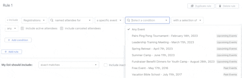 If you have a lot of events and signups, it can be cumbersome to find the specific events you want to use in list conditions in People. Now you can search for events when adding conditions!