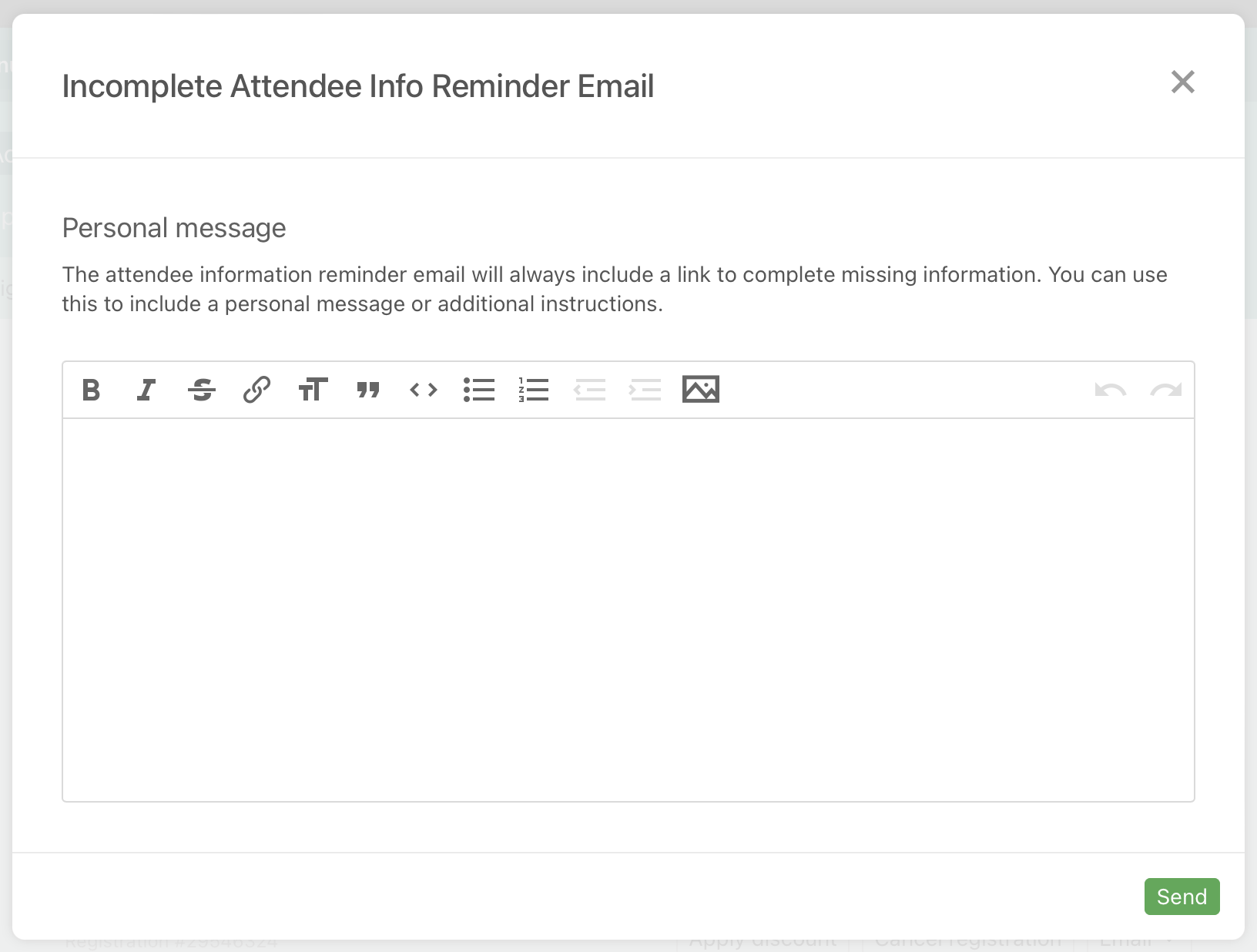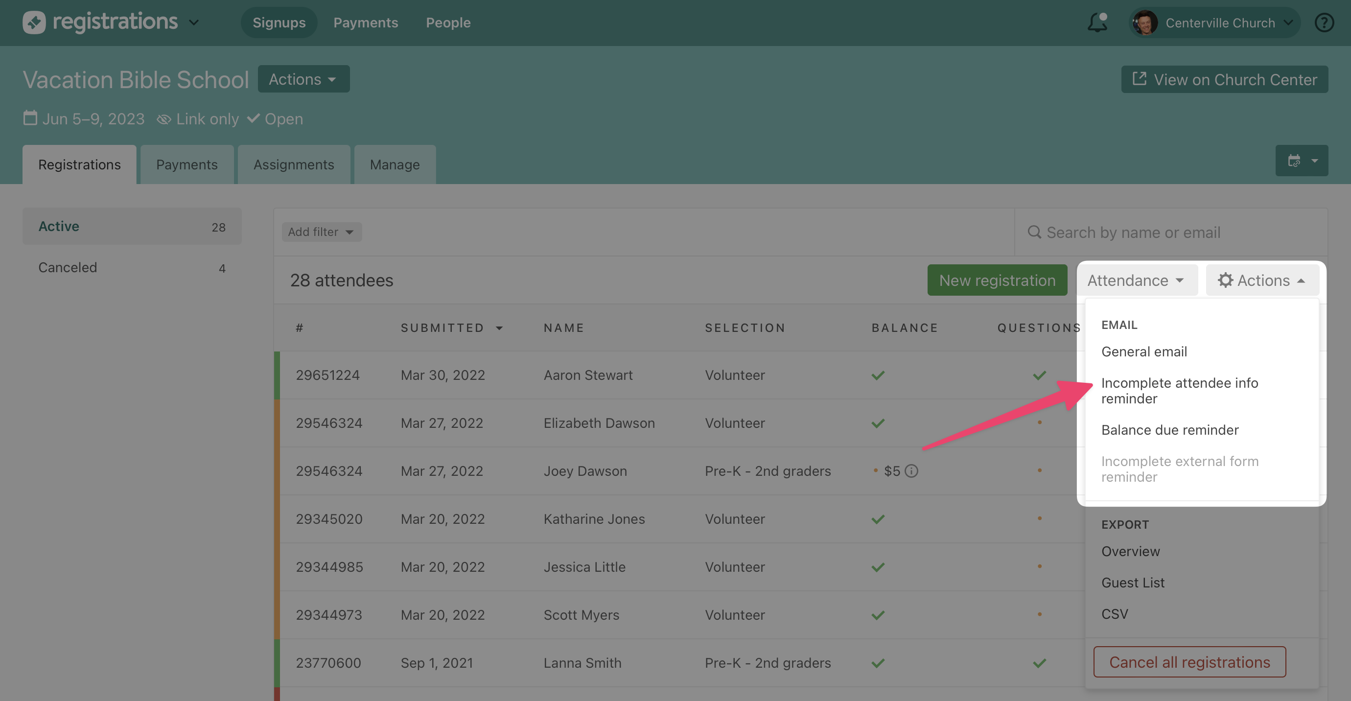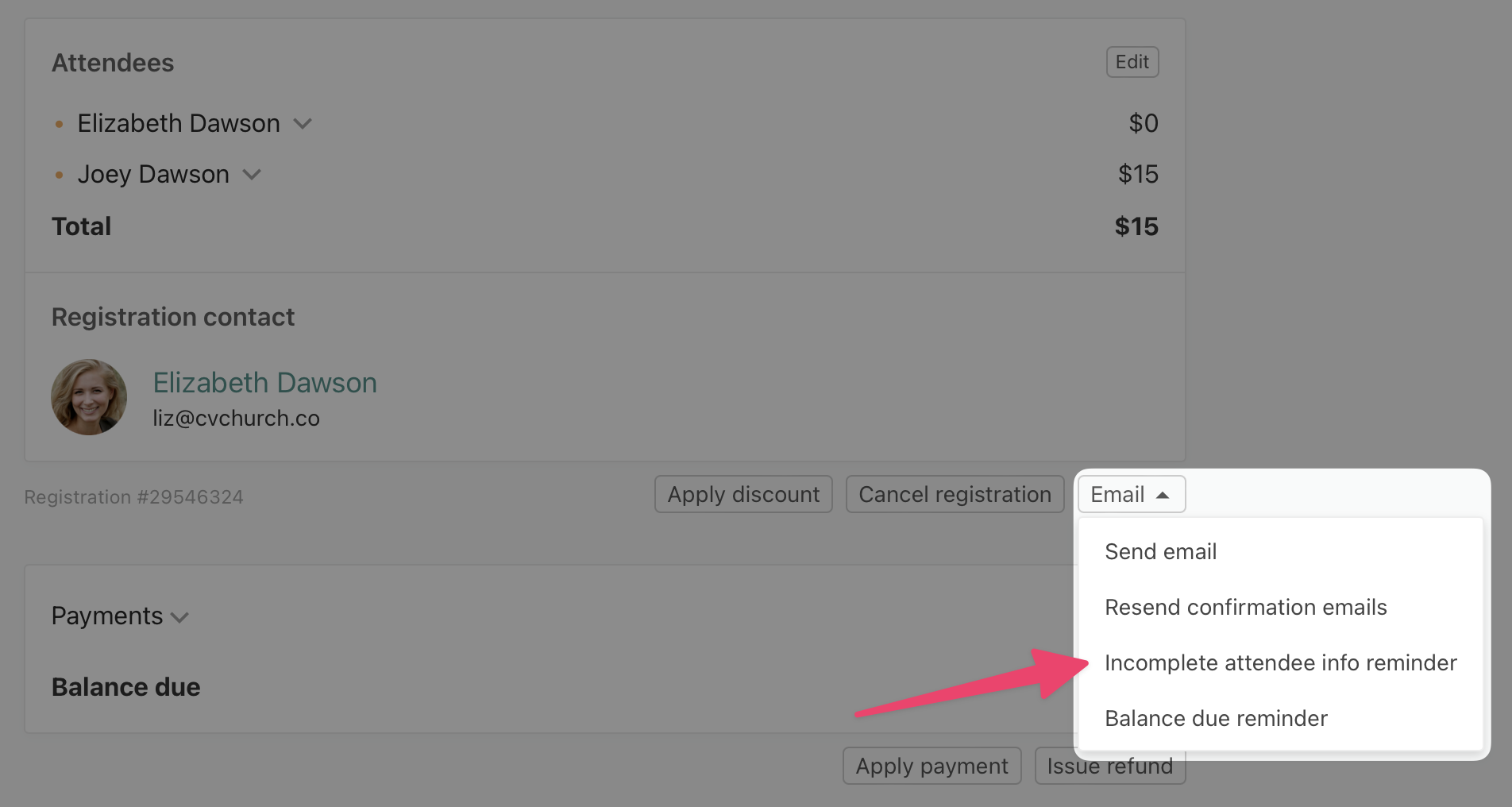 To help your event mangers follow up with these folks, we've added an incomplete attendee information reminder! You'll see this option from both the actions dropdown on the registrations list as well as the email dropdown on an individual registration.