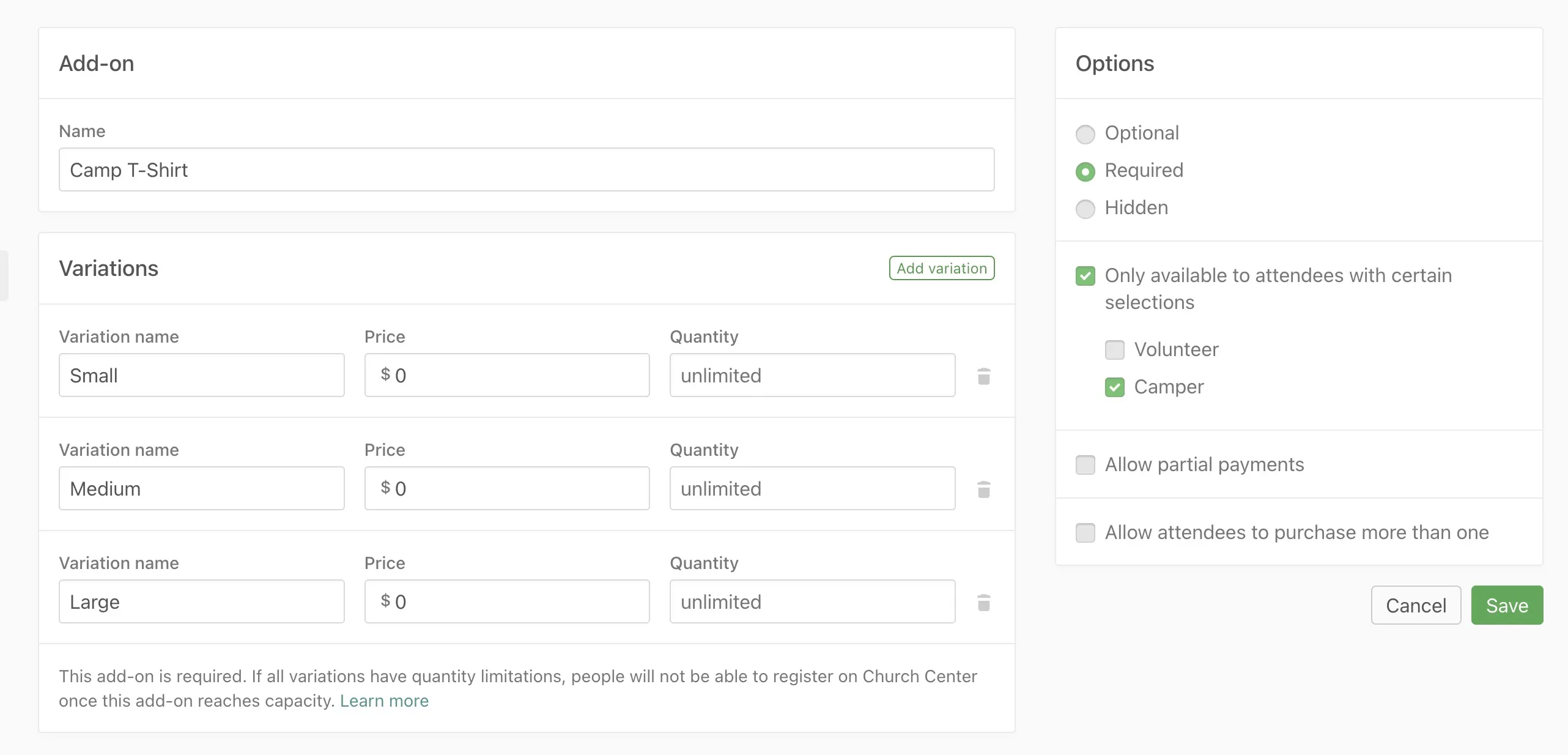 When this option is enabled, the add-on will be required during registration on Church Center.