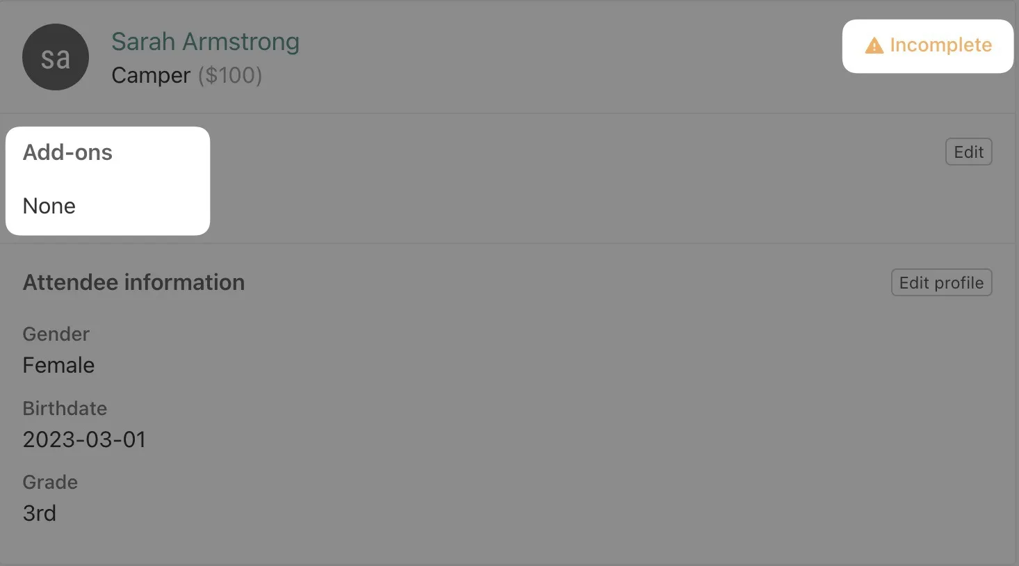 If a registration is missing a required add-on — because the person was registered by an admin, or because the add-on was added after the person registered — it will show as incomplete on the admin side of Registrations.
