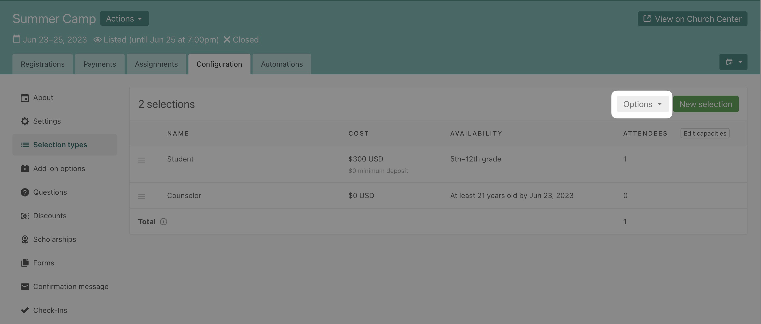 In addition to creating the selections that your registrants will be able to choose from, the Selection Types page now houses advanced options for selections like maximum quantity and split registrations. You can find these advanced options in the new Options dropdown, here: