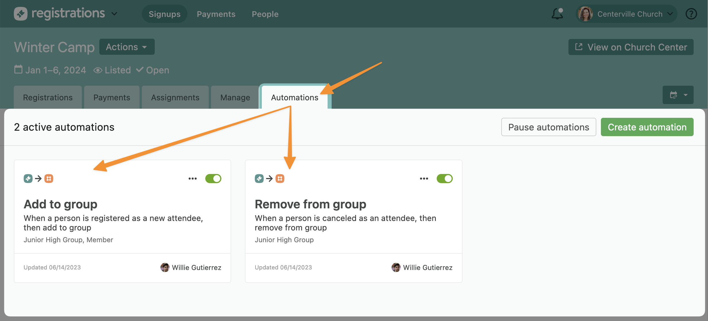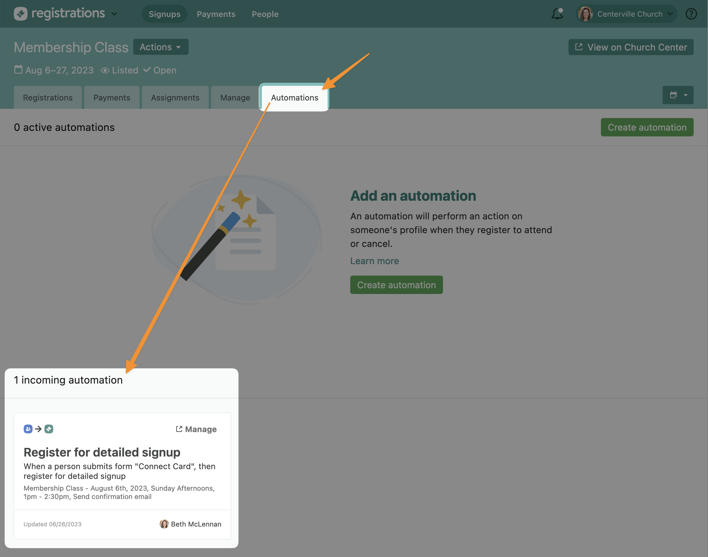 Another great feature included is the ability to see any automation signing people up for the event. Rather than having to open every group or form and list to hunt down the how of a new signup, Registrations admins* will now see all automations adding to a signup within that new tab.