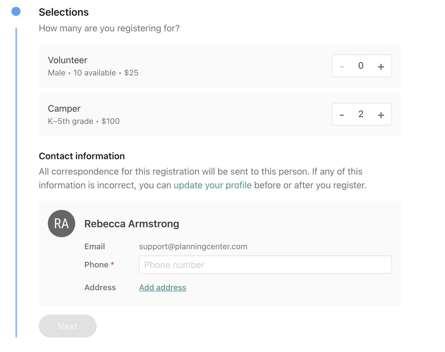 When someone registers on Church Center, they'll see those fields on the Selections step, where they can provide missing requested information. If they need to update existing contact information, there's a link to their profile where they can manage that.
