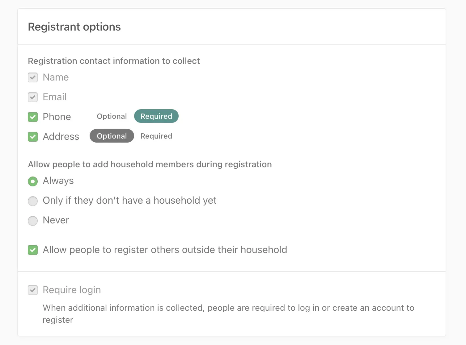 Registrations offers the ability to collect various types of information from people who are attending your events. In many cases, you'll probably need to collect contact information from the registrant (the person creating the registration) and personal information (birthdate, grade, gender) for each attendee. The ability to collect contact information was previously only available for attendees, but now you can collect contact information from the registrant!