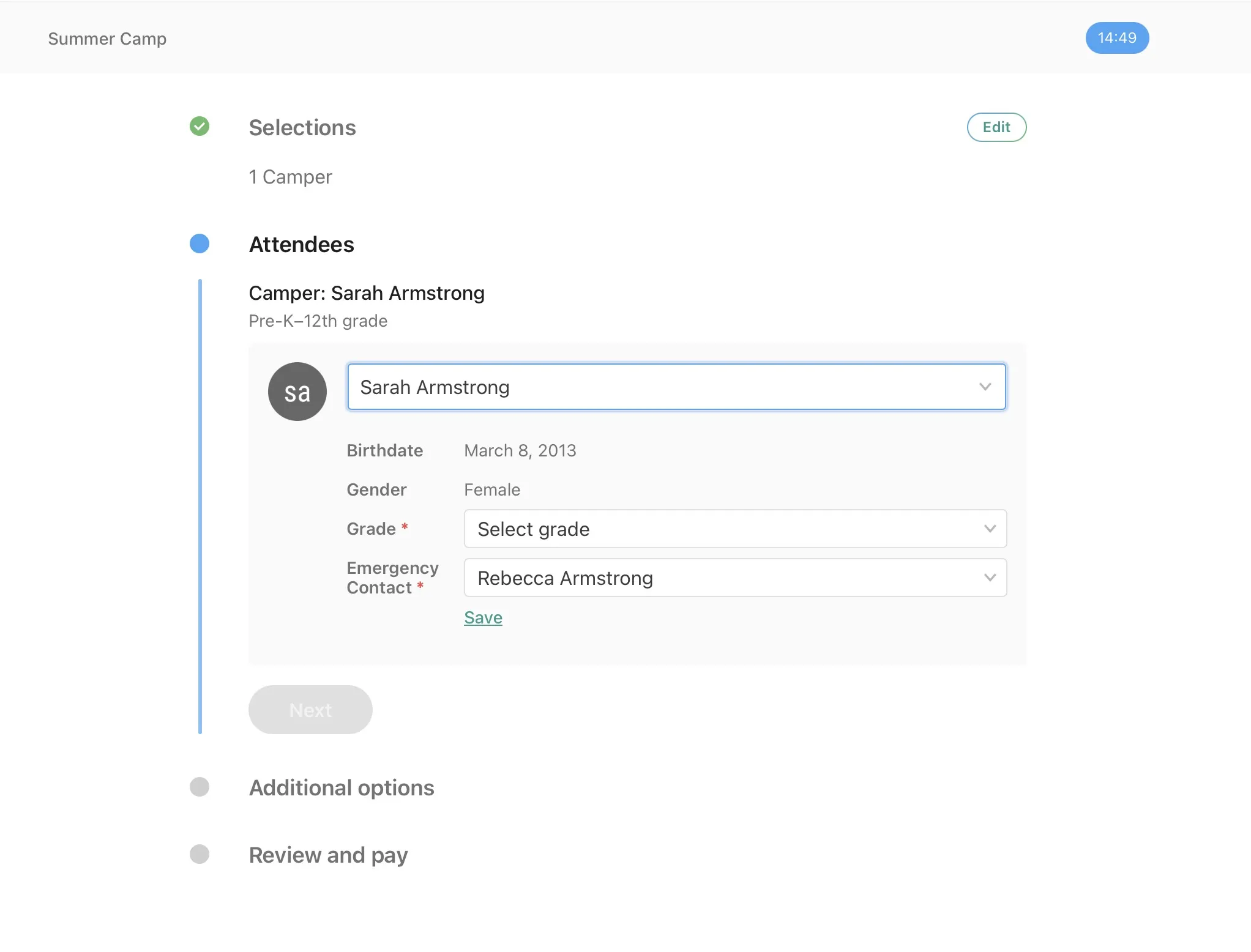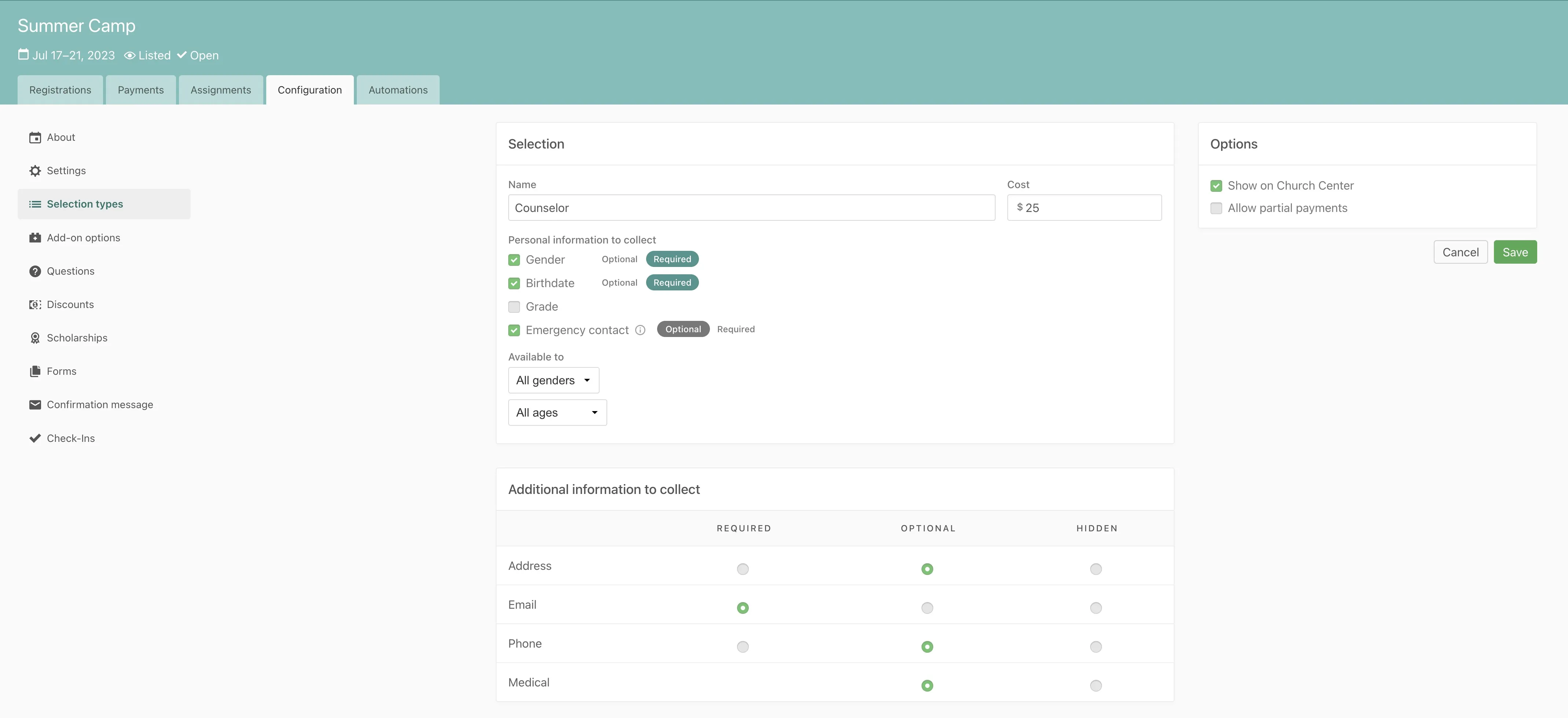 When you're collecting registrations for an event at your church, some information is important to have up front. For example, if you're hosting a summer camp, it's important to have attendee information like grade, gender, and emergency contact, while other information like medical release forms may best be suited to fill out as a follow-up to the registration.