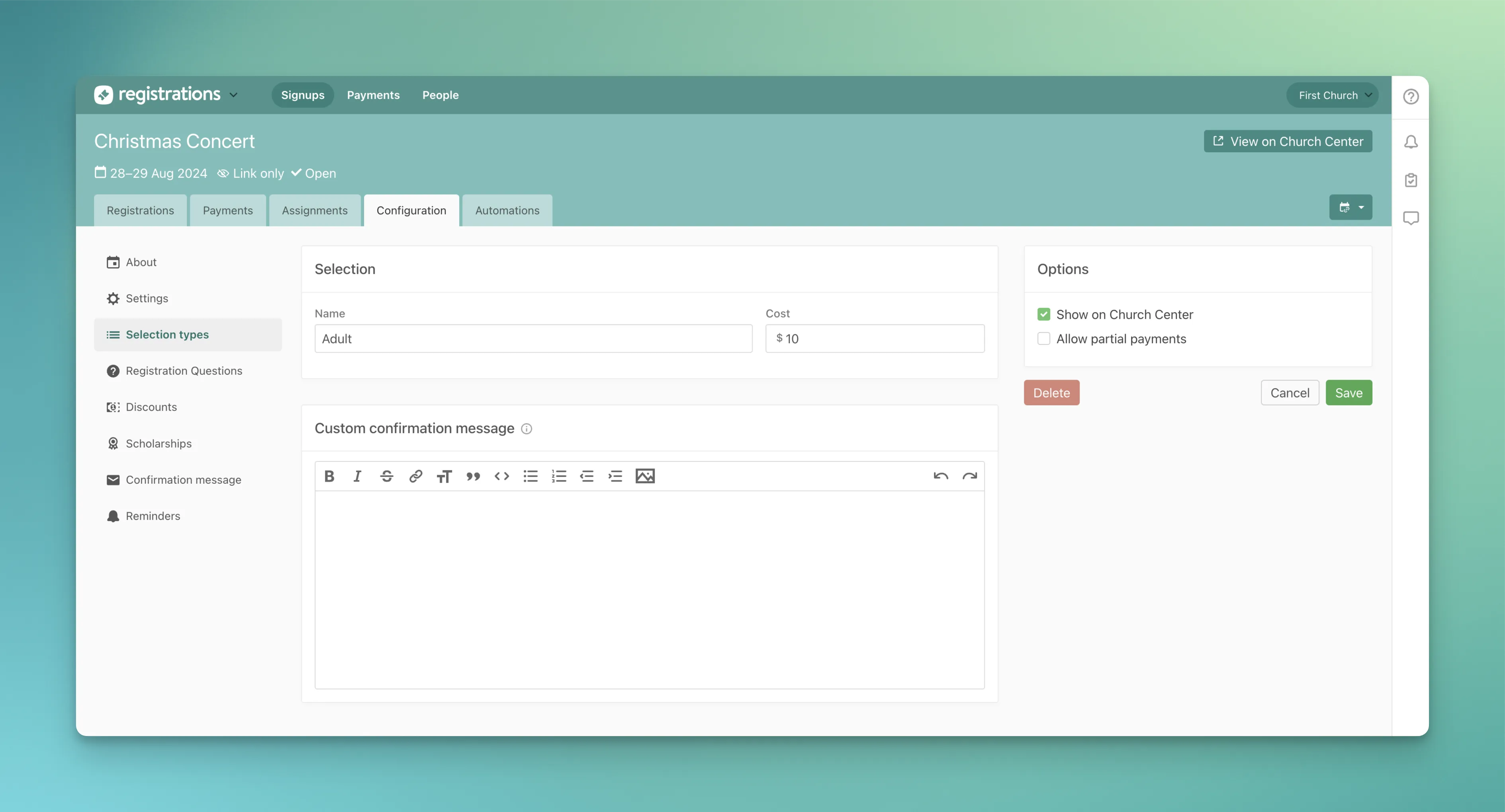 Manage Discounts and Scholarships: Just like in Detailed, you will now see Discounts and Scholarships as configurable options inside your signup.