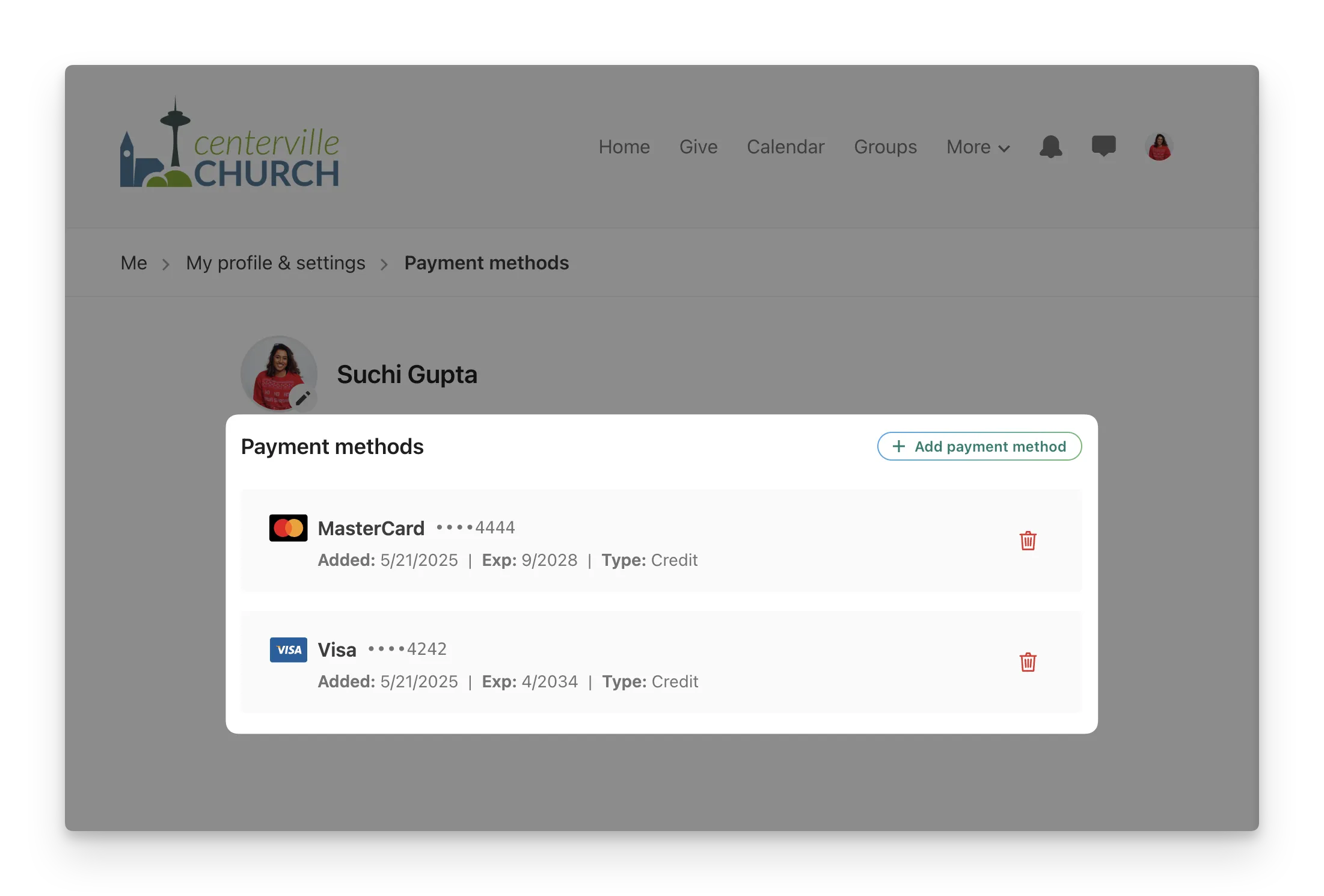 All saved cards are now managed directly from a person’s profile in Church Center, whether on web or mobile.
