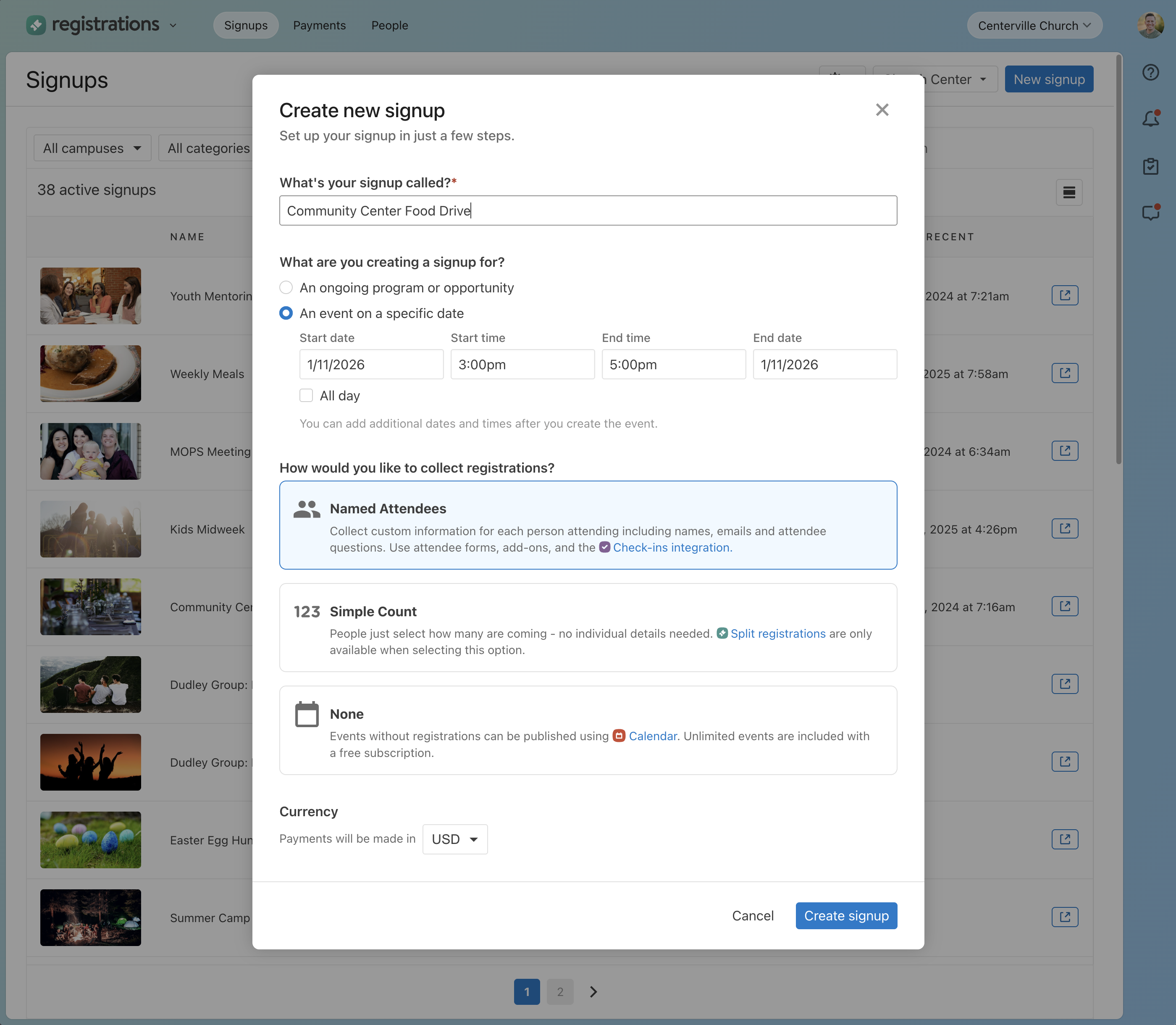 Creating a signup in Registrations is now faster and more intuitive. The old three-step process has been replaced with a single screen that gets you up and running quickly.