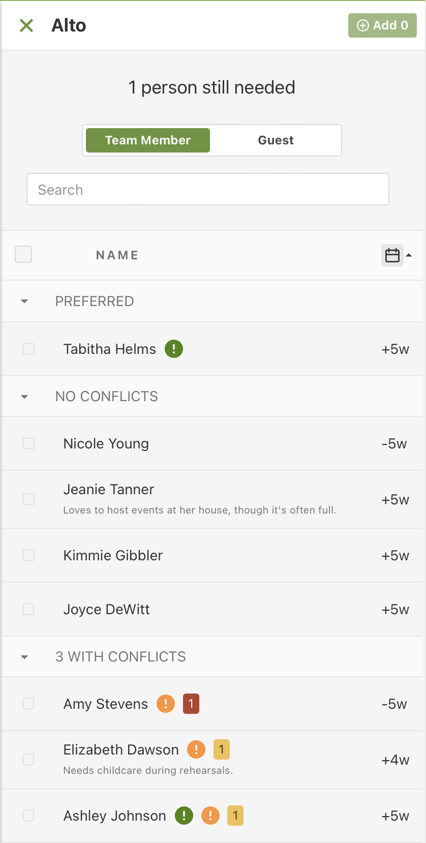 Many teams need a similar number of people each week, but don't have a regular pattern to how those people are scheduled. By adding Needed Positions, you not only see how many people you need, but when you click, you see all the people assigned to that position, sorted using their preferences and conflicts, with your best options at the top. That smartly-sorted list of people is now loading faster, with bigger teams seeing the most improvements in speed.