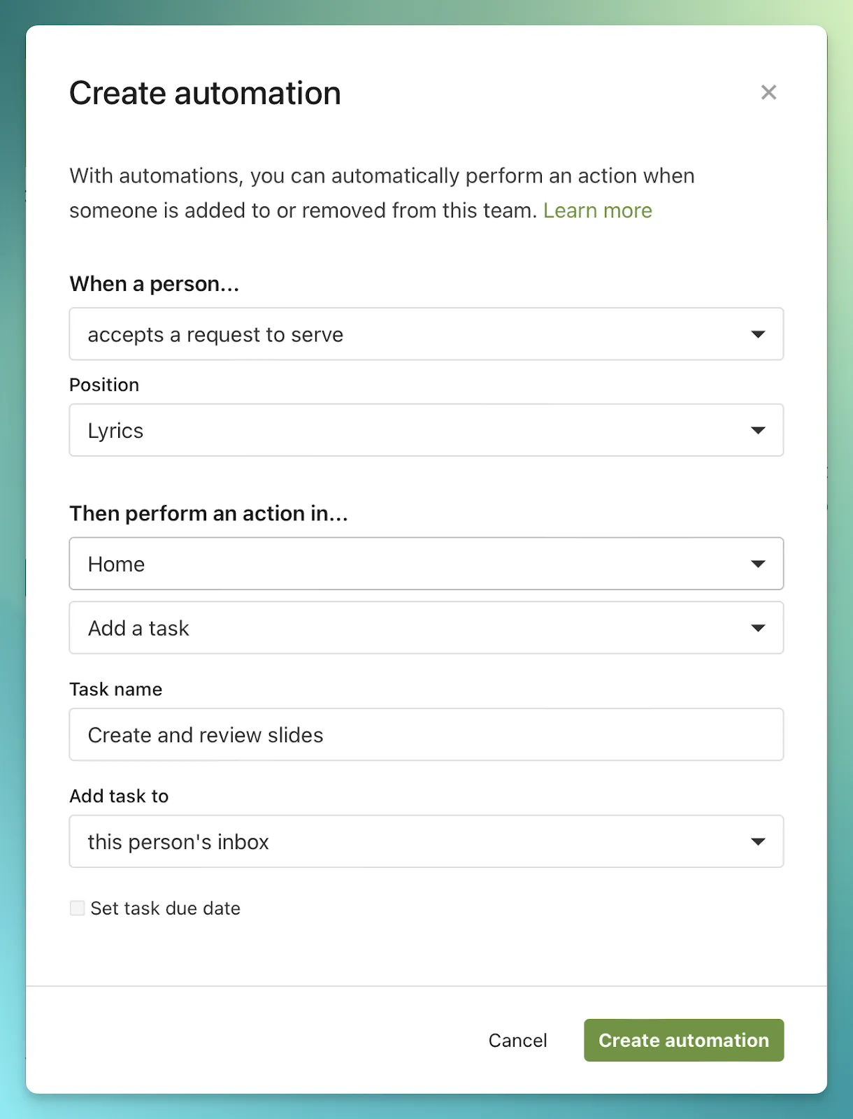 Now, when a person accepts the lyrics position on the tech team, the automation creates a corresponding task in their task inbox. Enjoy these new automation options!