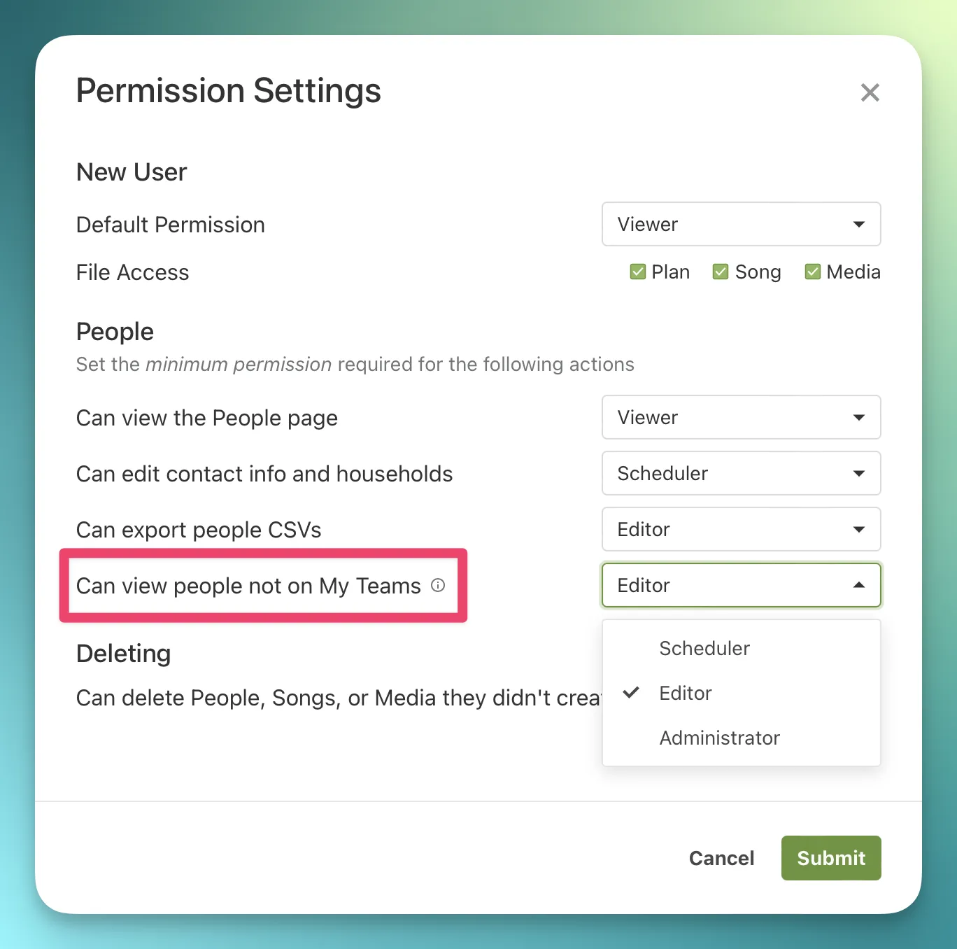 This change rectifies a potential security vulnerability and will hopefully be a rather seamless transition for most people as it only impacts the /people endpoint. We now ensure that it only returns results that are aligned with the “Can view people not on My Teams” setting which can be found in the Permission Settings modal on Services’ People page.