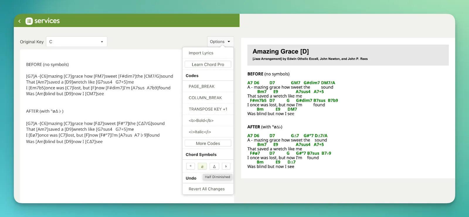 We’ve added support for the diminished, half diminished, major, and flat symbols. In the picture below, you’ll see what your charts will look like with and without using the new symbols.