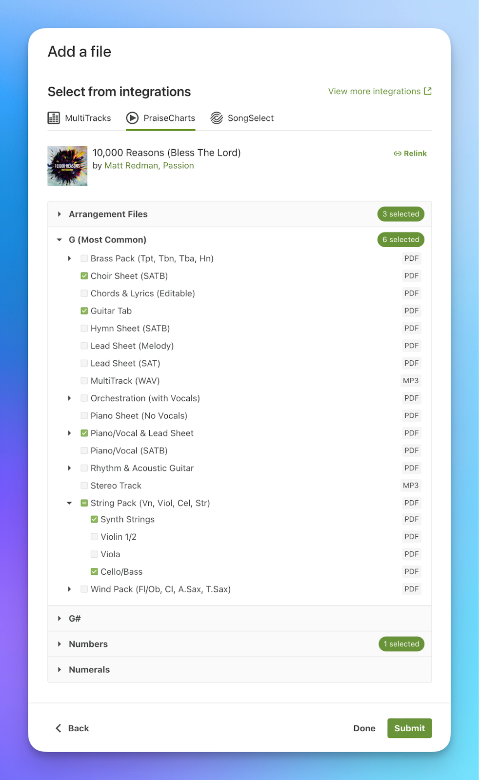 To use this new feature, simply add a file to a song that you’ve purchased in PraiseCharts and you’ll be met with a selection screen that will look something like this: