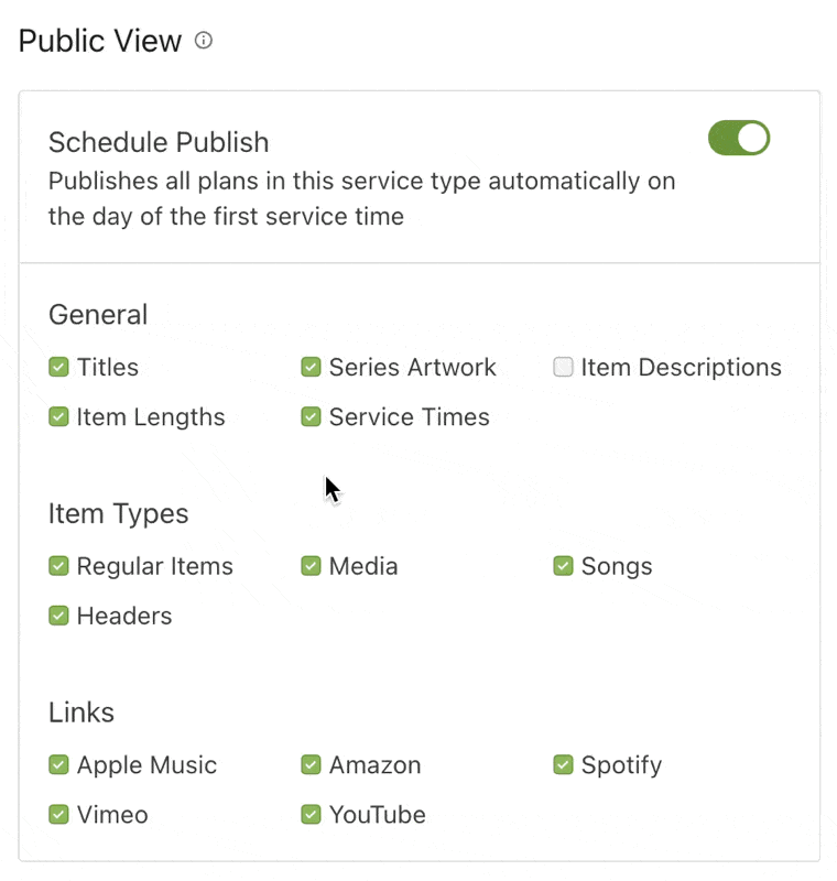 You can now display item description for your Plan Items in the Public Plans view, making it easier for your congregants to follow along. Simply go to Service Type Settings and enable item descriptions.