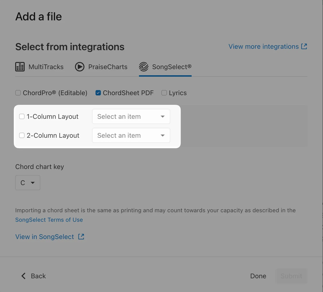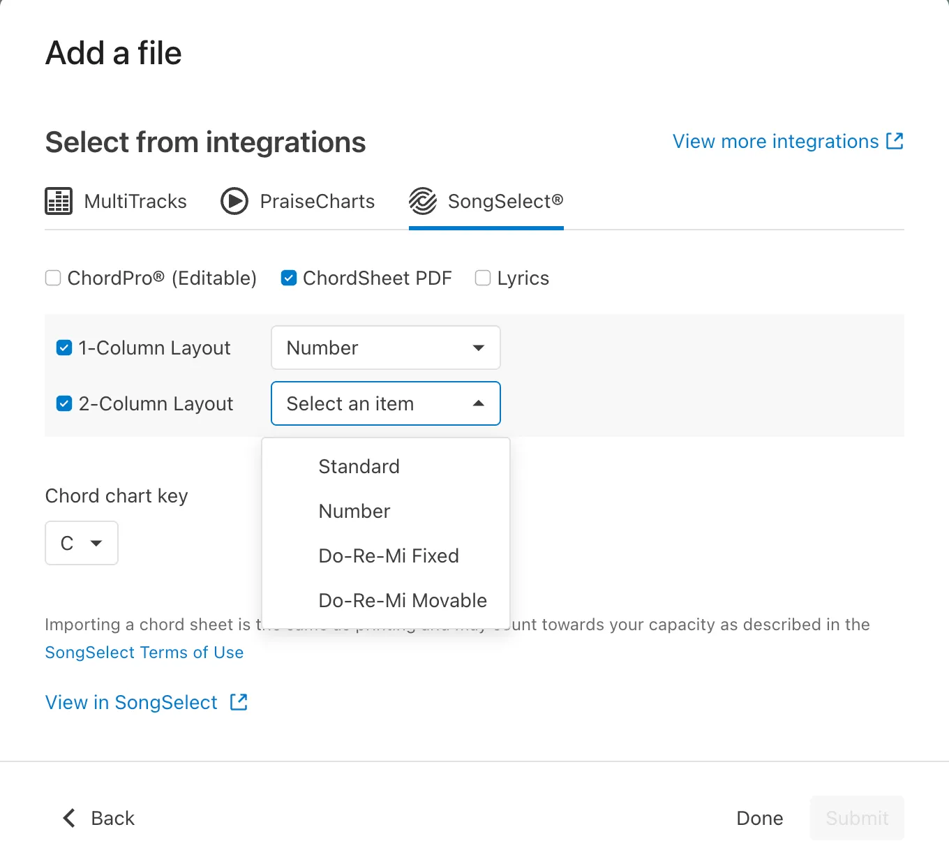 If you have a SongSelect subscription with the integration enabled, the new layout and chart type options will appear when importing a ChordSheet PDF. You can mix and match any layout and chart type combination to share with your team.