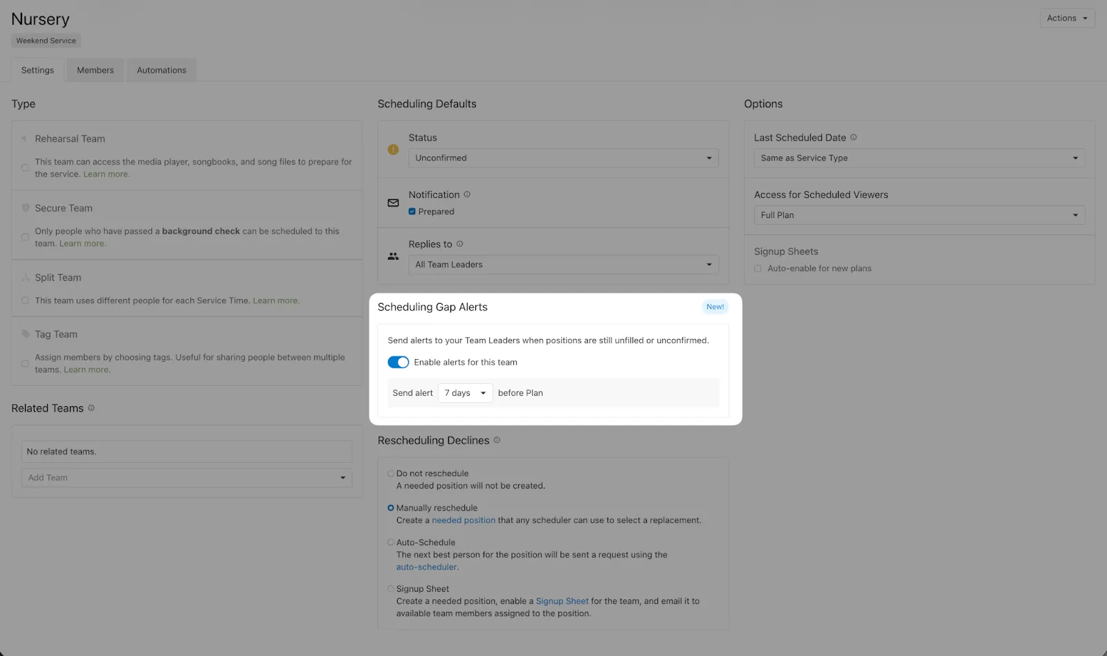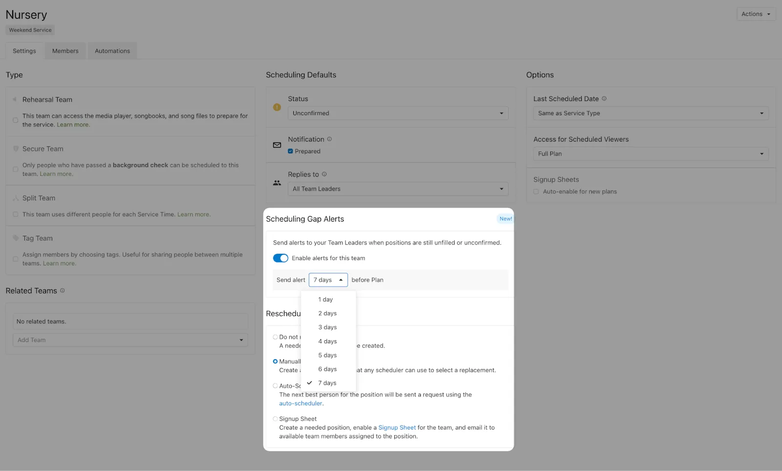 Turn on gap alerts in the team settings page, and choose how many days before a service you’d like leaders to get an alert (anywhere from 1–7 days).