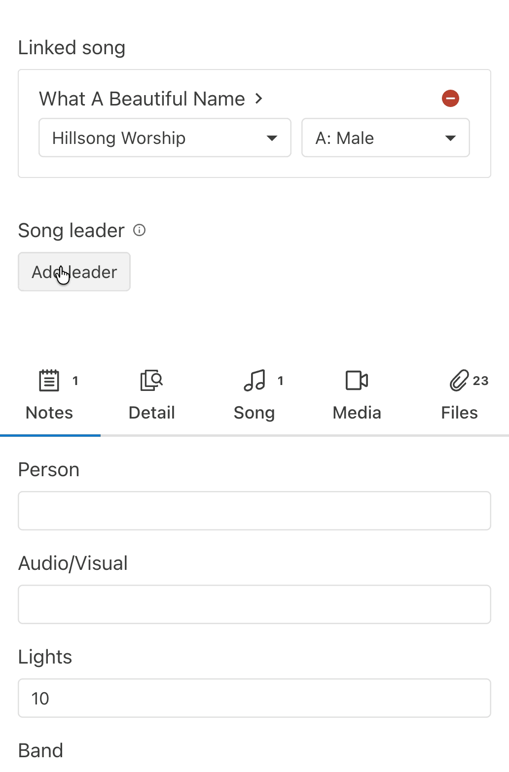 One clear place to assign who is leading any song or item
