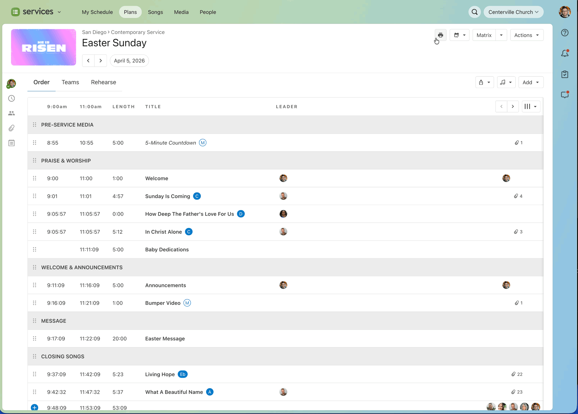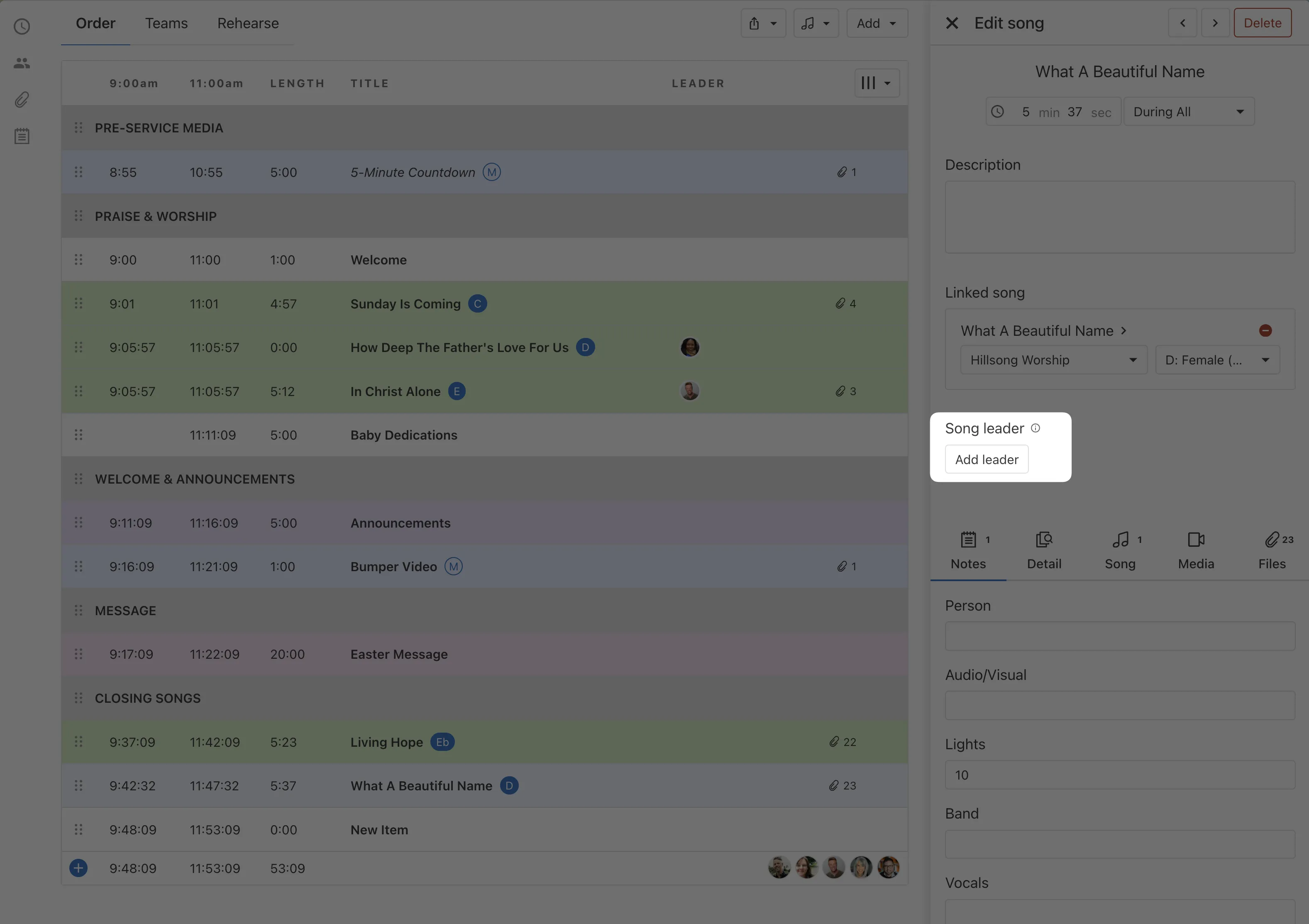 Open any plan in Services, hover over a song or item, and click the new leader icon to make your first assignment. You'll see leader avatars appear right in your order of service, and your team will always know who's responsible for what.