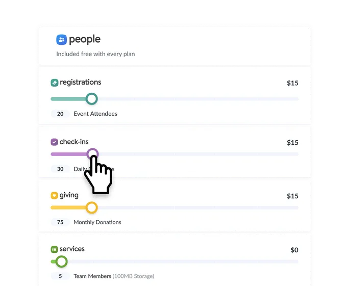 Our pricing is customizable based on what your church needs. We don’t want you to pay for anything you’re not going to use! So select only the products you need, adjust your plan level whenever you want, and cancel at any time.