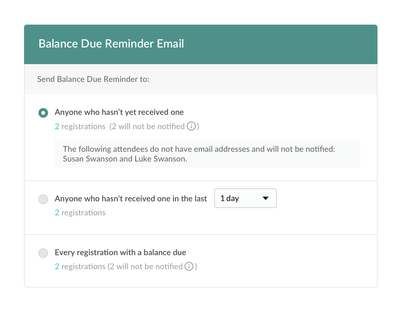 Email registered attendees or main registration contacts with balance-due reminders, event details, and incomplete information reminders.