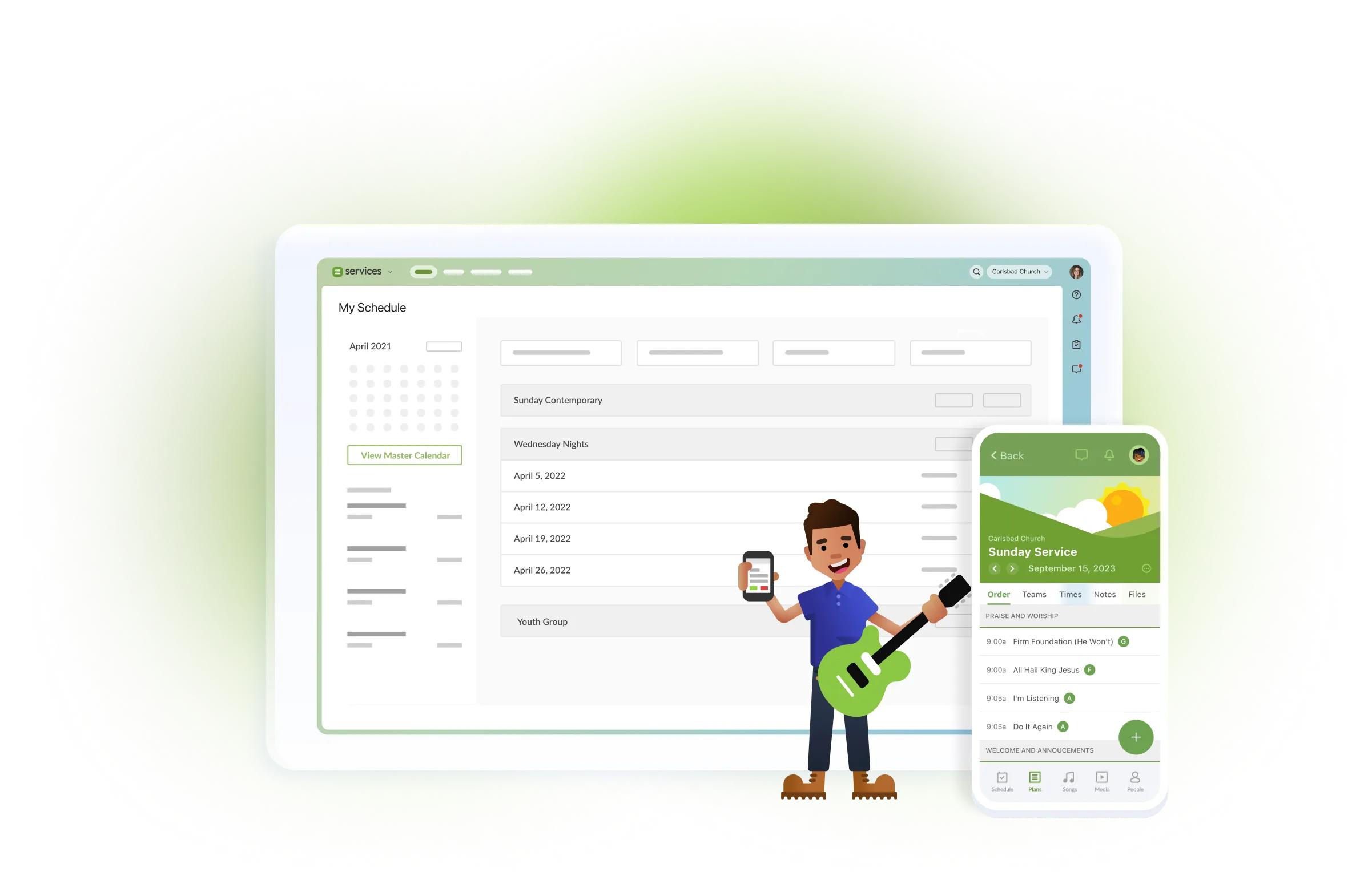 Worship planning, volunteer scheduling, team communication, and rehearsal tools all in one place.