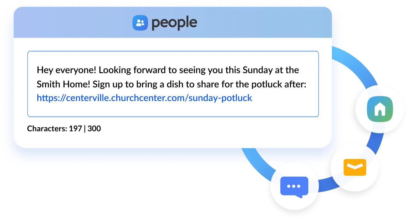 Let people know what’s going on at your church—whether it’s launch events, community gatherings, or last-minute location changes—via email, text, or push notifications.