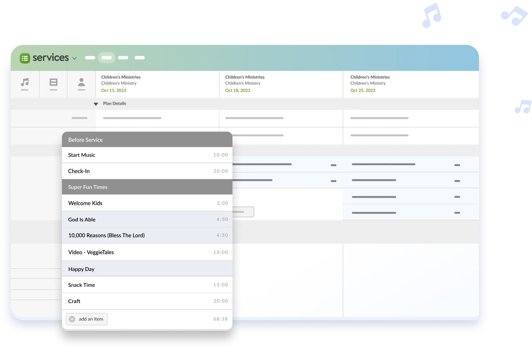 Planning Center has tools for every area of ministry. Give your team access to what they need to get organized, whether it’s prayer group, children’s check-in, set-up, leading worship, and more.