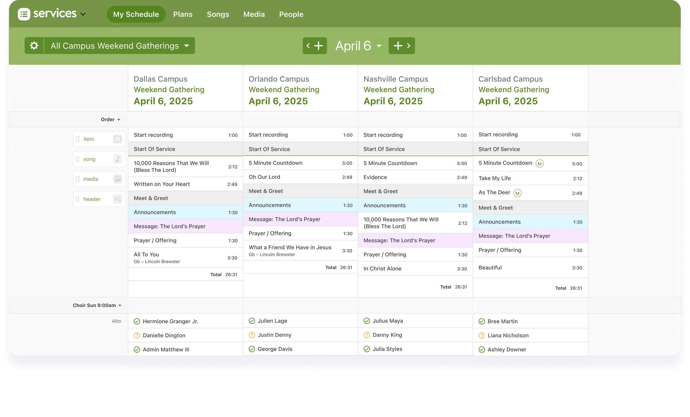 Plan your services weeks ahead, arranging each service just the way you want it to flow. Whether you’re simulcasting or running individual services, you can offer a consistent experience across every campus.
