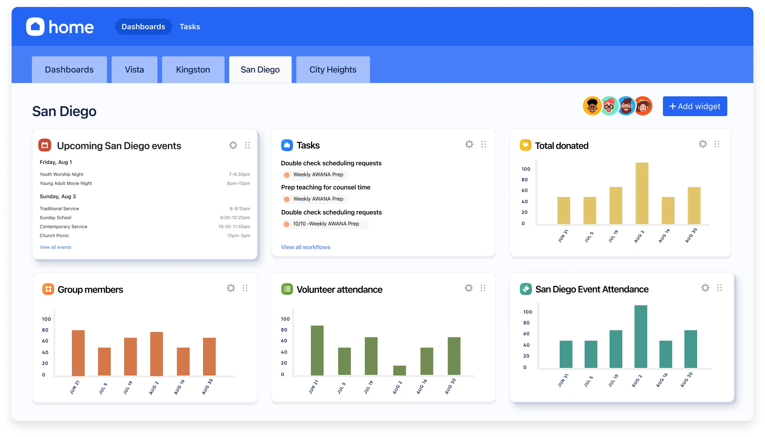 Keep a pulse on campuses with attendance reports, event signups, giving data, and more.